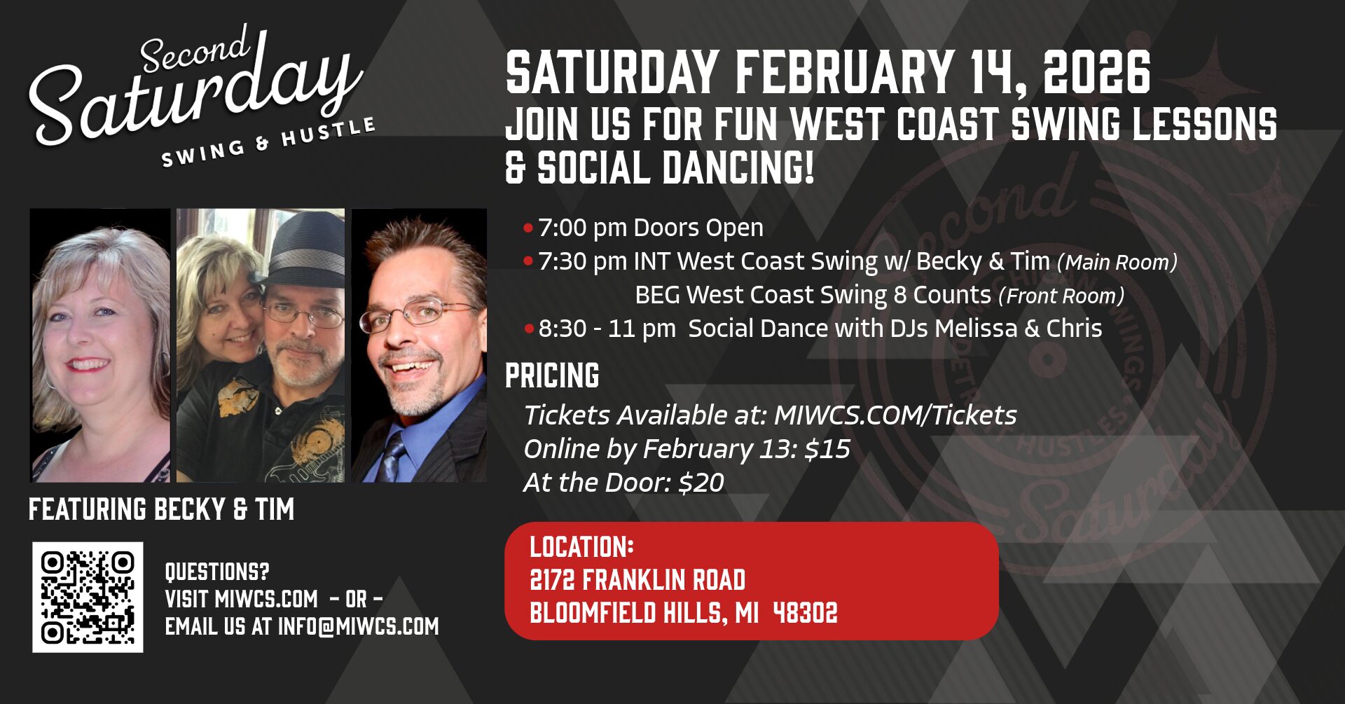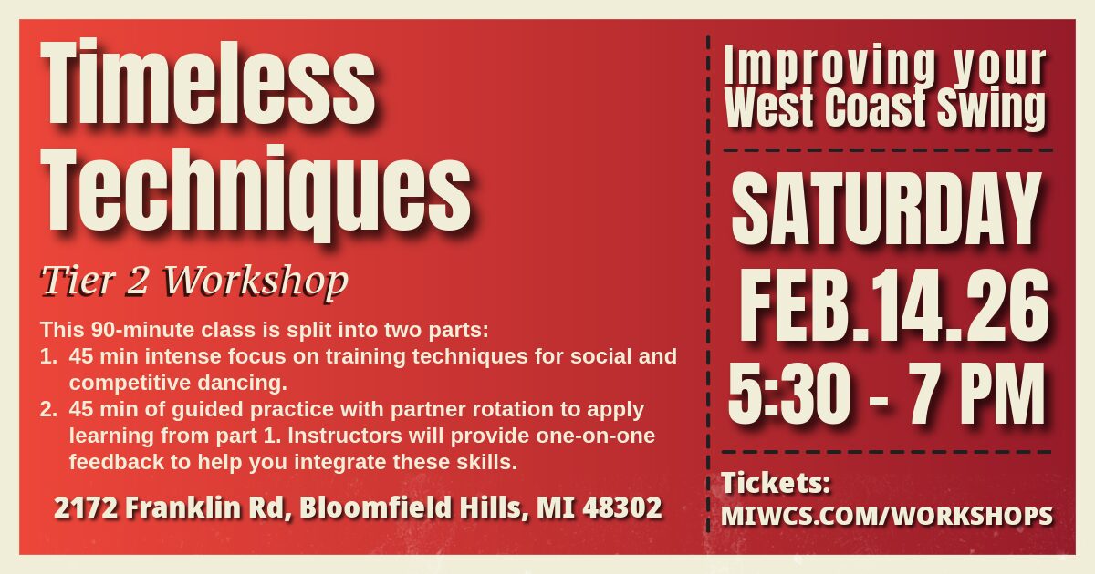 Chris and Melissa are available for workshops, private lessons, group lessons, judging, choreography, and demonstrations. You can find them teaching and hosting regularly at Second Saturday Swing and other local venues. For their latest schedule visit miwcs.com, find them on their socials at miwcs.com/connect, or email them at info@miwcs.com.